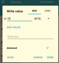 - 헥사 값 0x10을 입력하고 SEND 버튼을 누릅니다. 그러면 아두이노 나노 보드에 LED가 켜지는 것을 볼 수 있습니다.