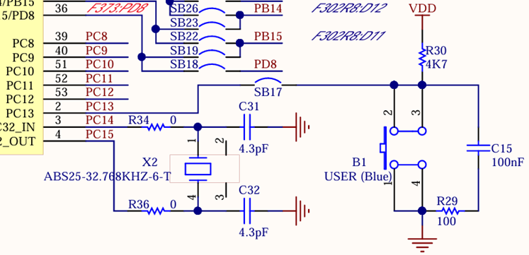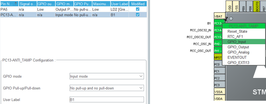 PC13번 핀에 버튼(B1, USER)이 연결되어 있는데, 평상시에는 VDD에 연결되어 있기 때문에 PULL-UP으로 HIGH 입력입니다. 버튼을 누르면 LOW로 입력 값이 변경됩니다.