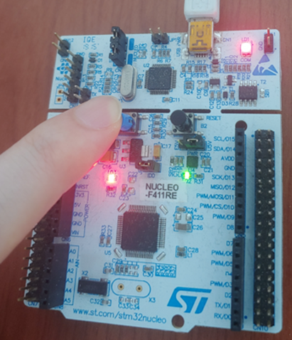 파란색 버튼(User Button)을 누르면 LED2 켜지는 것을 확인할 수 있습니다.