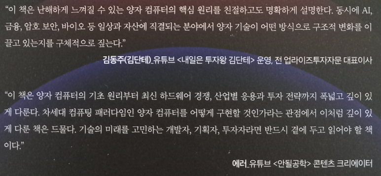 p9 - "이 책은 양자물리학의 복잡한 수식을 파고드는 이론서가 아니다. 오히려 양자 컴퓨팅이라는 낯선 대륙을 탐험하는 여행자를 위한 안내서에 가깝다. 이 기술이 어떤 원리로 작동하는지, 핵심 플레이어들은 누구이며, 어떤 전략을 쓰고 이는지 그리고 앞으로 어떤 산업이 어떻게 바뀔 것인지에 대한 큰 그림을 그리고자 했다."