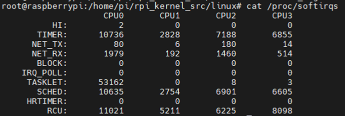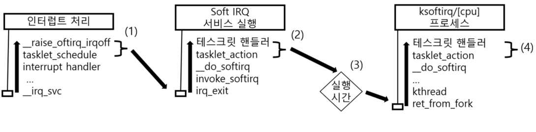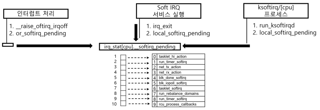 안녕하세요. 이번에서 앞에서 알아본 Soft IRQ 이벤트를 분석하고 서비스 실행 횟수확인 해보겠습니다. 1. Soft IRQ 이벤트를 위한 ftrace 1) 이벤트 활성화 커널에서 Soft IRQ를 위한 이벤트를 제공합니다. softirq_rasie : Soft IRQ 서비스를 요청, 실행함수는 __raise_softirq_irqoff() softirq_entry : Soft IRQ 서비스 실행 시작, 실행함수는 __do_softirq() softirq_exit : Soft IRQ 서비스 실행 마무리, 실행함수는 __do_softirq() 이전에 사용했던 스크립트를 활용해서 이벤트를 활성화합니다. #!/bin/bashecho 0 > /sys/kernel/debug/tracing/tracin..